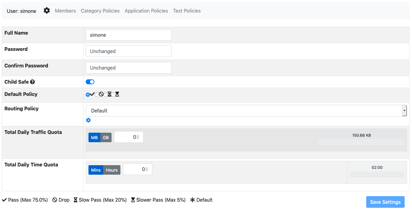 The Child Safe option enables child protection for the specified user by blocking adult web sites. More information about policies can be found on the policies section.
