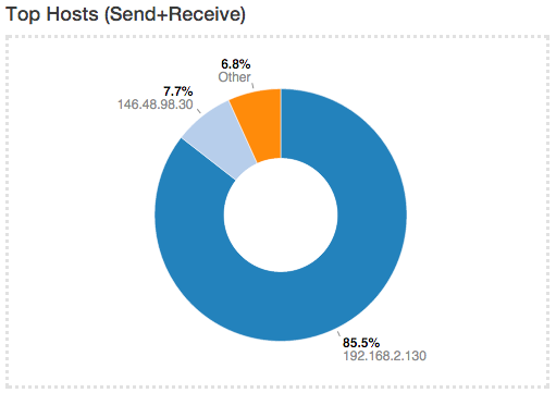 The Top Hosts view provides a pie chart representation of the captured traffic. Aggregation is done on a per-host basis. Similarly to the Sankey Diagram discussed above, any host name (or non-resolved IP address) shown can be double-clicked to visit the corresponding ‘Host Details’ page.