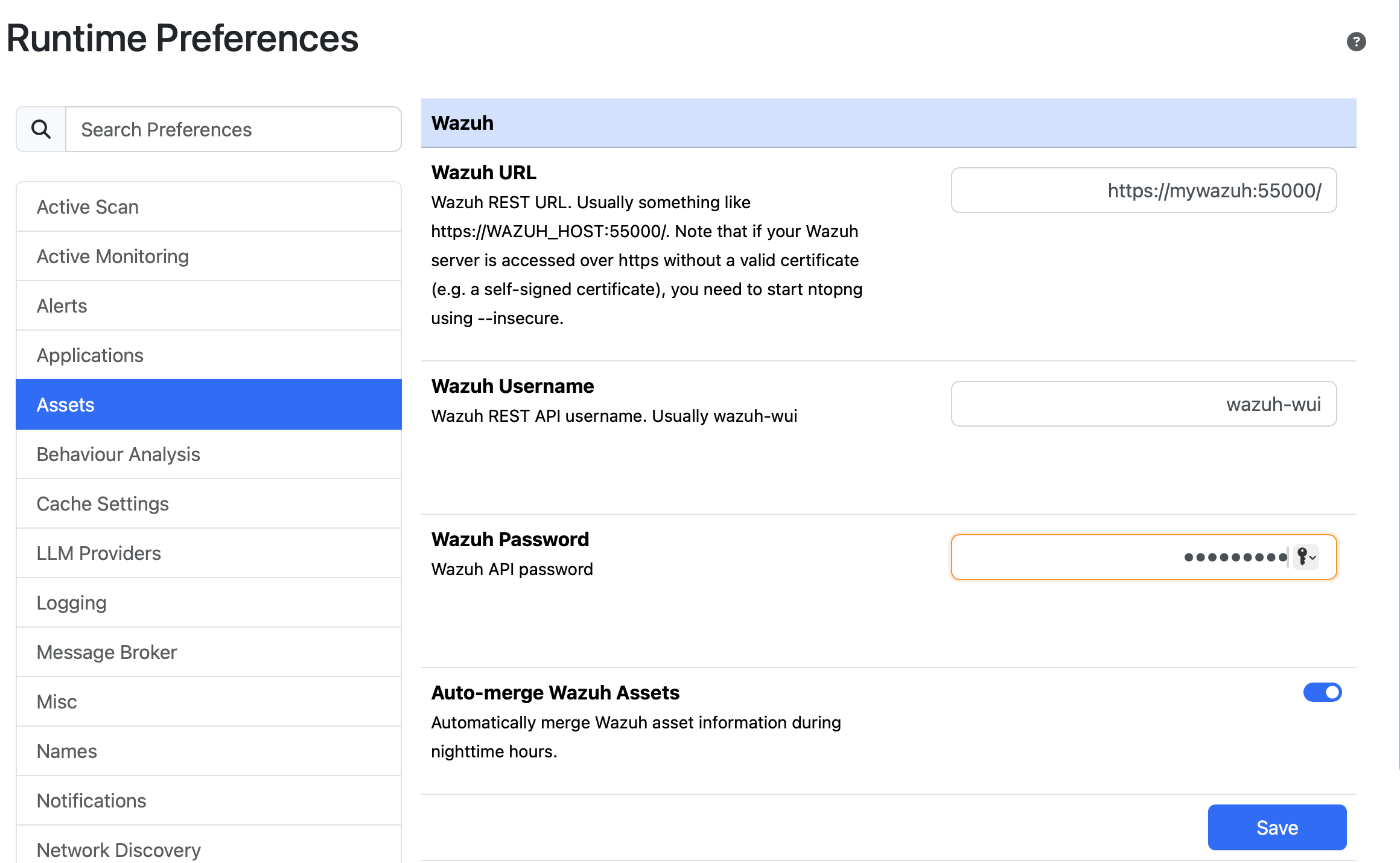 Under Preferences -> Assets you can now specify the URL/username/password of the Wazuh server console that will be accessed by ntopng using the REST API. Once this information is configured, under the Hosts -> Assets Inventory page